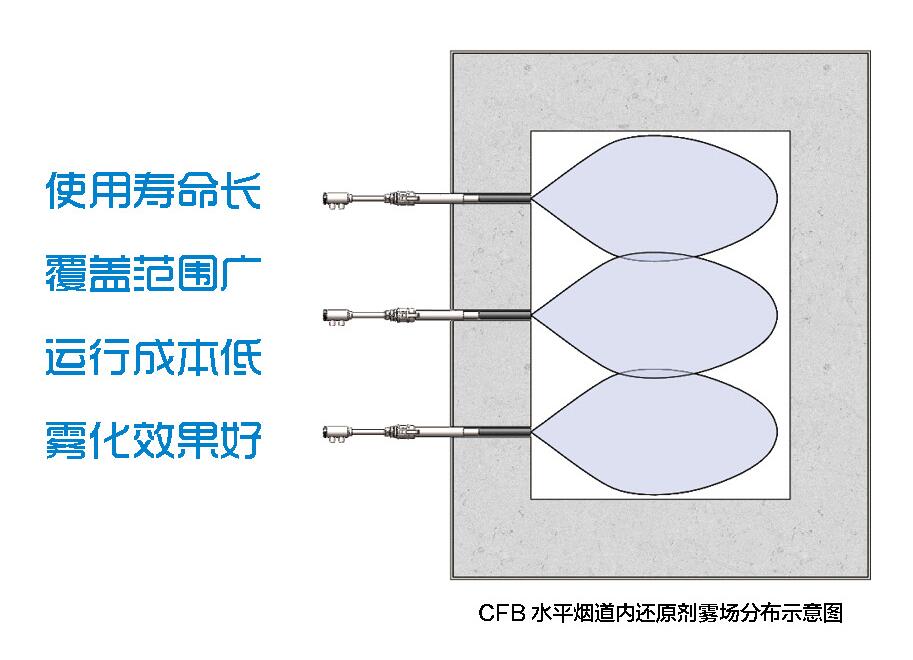 循環(huán)流化床鍋爐的水平煙道由于截面積小、煙氣溫度接近脫硝理想溫度,成為噴槍安裝的首選位置。我公司會根據(jù)現(xiàn)場實際情況和循環(huán)流化床水平煙道截面尺寸確定噴槍數(shù)量和布置形式,使還原劑霧場充分覆蓋煙道橫截面,確保還原劑與煙氣充分混合,從而達(dá)到最優(yōu)的脫硝效果。