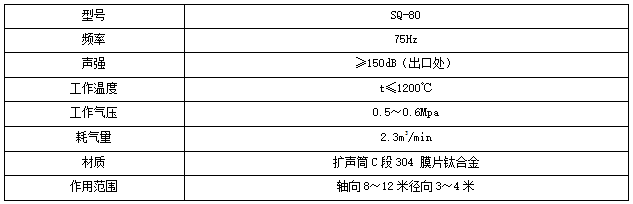由于需依托聲響能量使反響器內(nèi)塵土顆粒發(fā)生振動而清灰,有必要選用特定頻率的某些聲強,較低的頻率意味著有更大的清潔區(qū)域,具有更低頻率的聲波清灰設(shè)備可提供更大的有用清灰規(guī)劃。具體參數(shù)如下:
