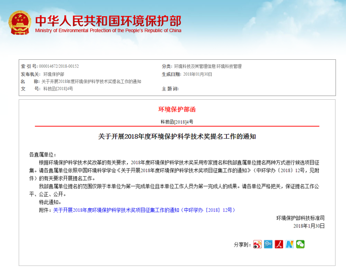 關于開展2018年度環境保護科學技術獎項目征集工作的通知